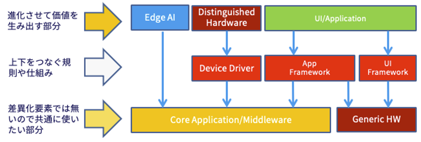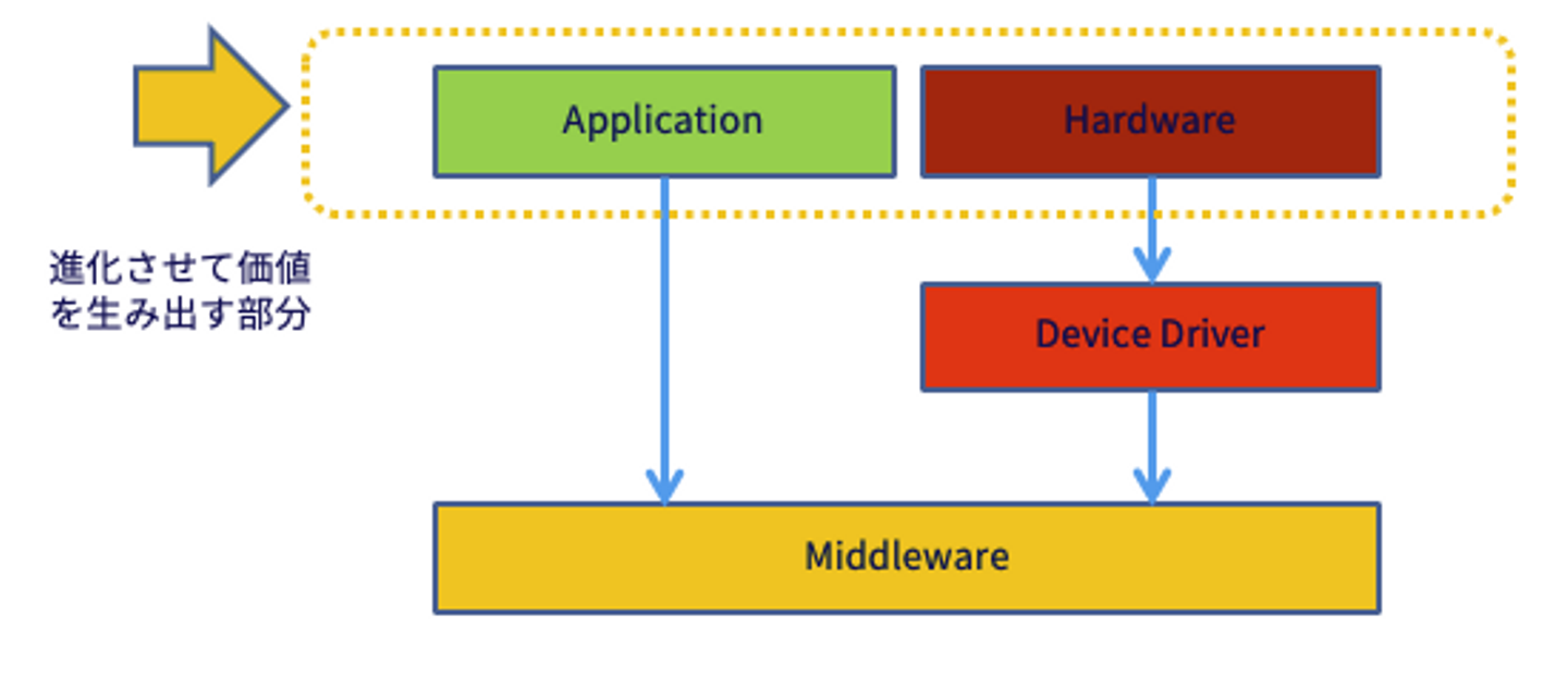 私たちASIOTが提唱する「ミックスドレイヤーモデル」は、アプリケーション×ハードウェアの両層を素早く進化させられるように設計されたフレームワークです。下図のように、上段にある「Application」と「Hardware」は、機能強化や最適化を加えることで新たな価値を生み出せる部分。一方、下段の「Middleware」は差異化になりにくい領域として標準化し、開発効率や保守性を高めています。