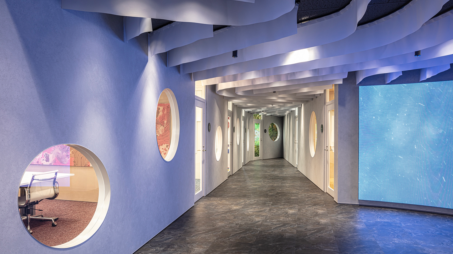 また各会議室が覗く丸窓は、深海の洞窟がモチーフ。好奇心を刺激するデザインにしつつ、使用中かどうかが外からもわかりやすいという機能性を有しています。