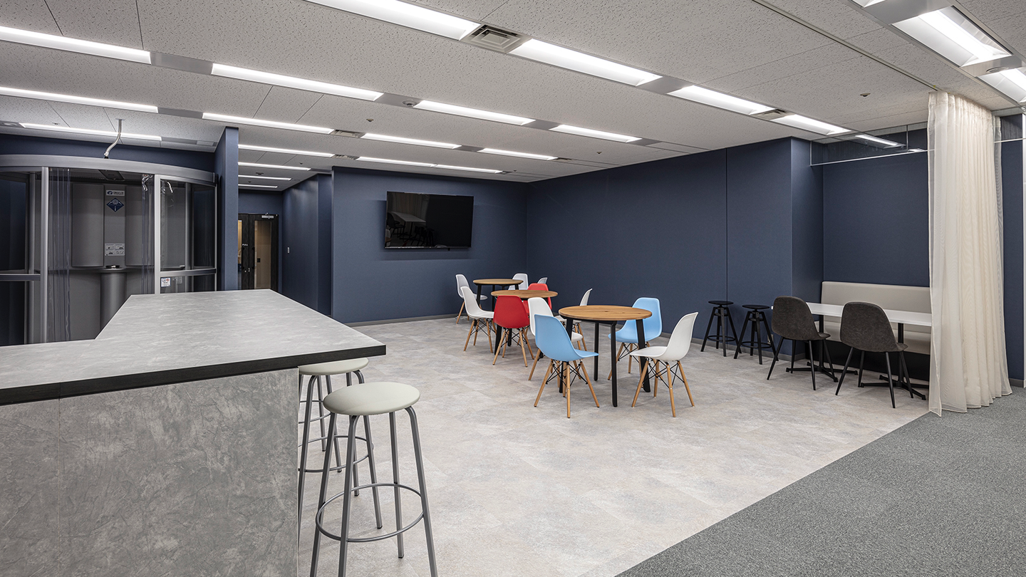 リフレッシュスペースはコンパクトながらカウンターバーのような空間と、カフェのようなテーブルとイスを設置しています。