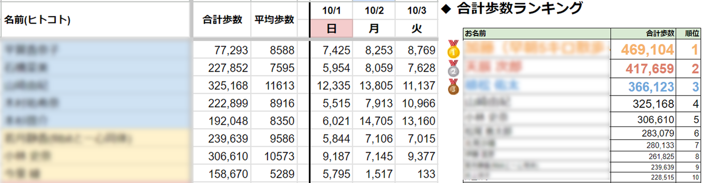内容:部署内で3~5名のチームを作り、上記期間中、1日平均7,000歩達成を目指す。