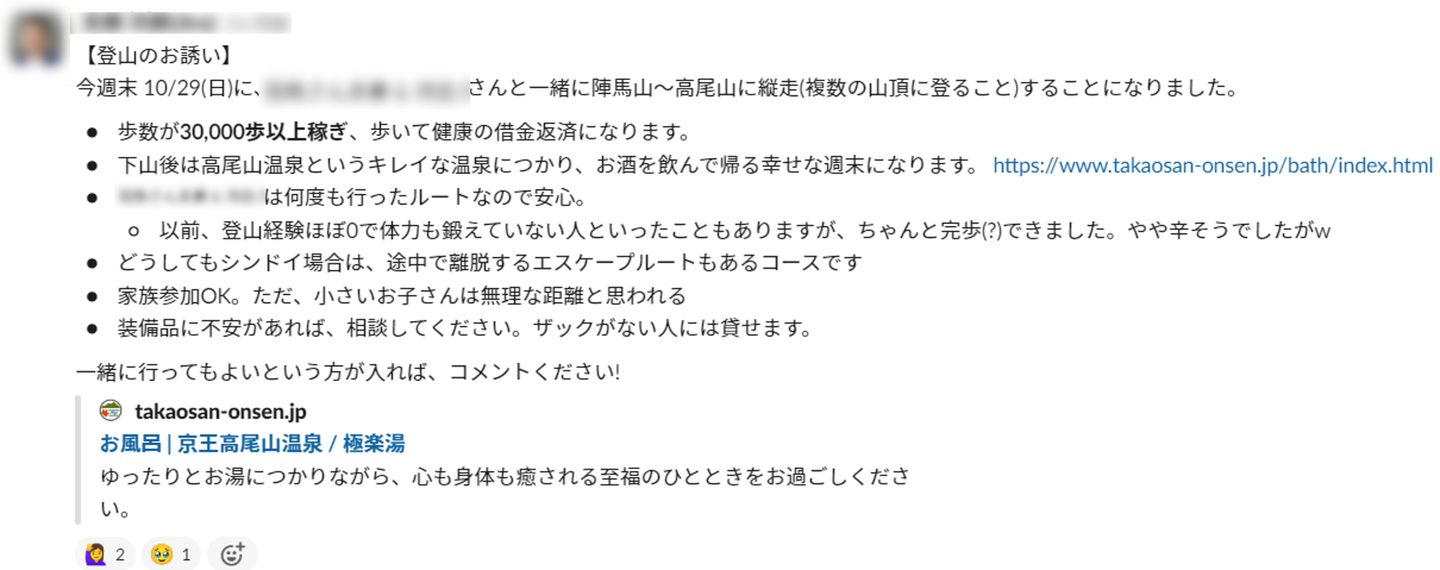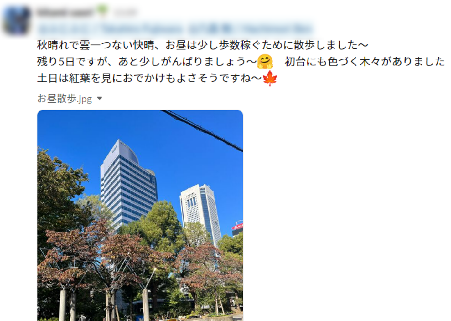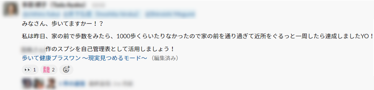 イベントをきっかけに散歩や縄跳びをする社員やランキングを見てやる気を出す社員がいたりと、スラックも盛り上がりました。他にも有志で高尾山の縦走を行うなど、期間中はいつも以上に運動に対して積極的な投稿が多かったです。リモートワーク主体の社員も少なくないので、コミュニケーション活性化の意味でも良い取り組みだったと思います。