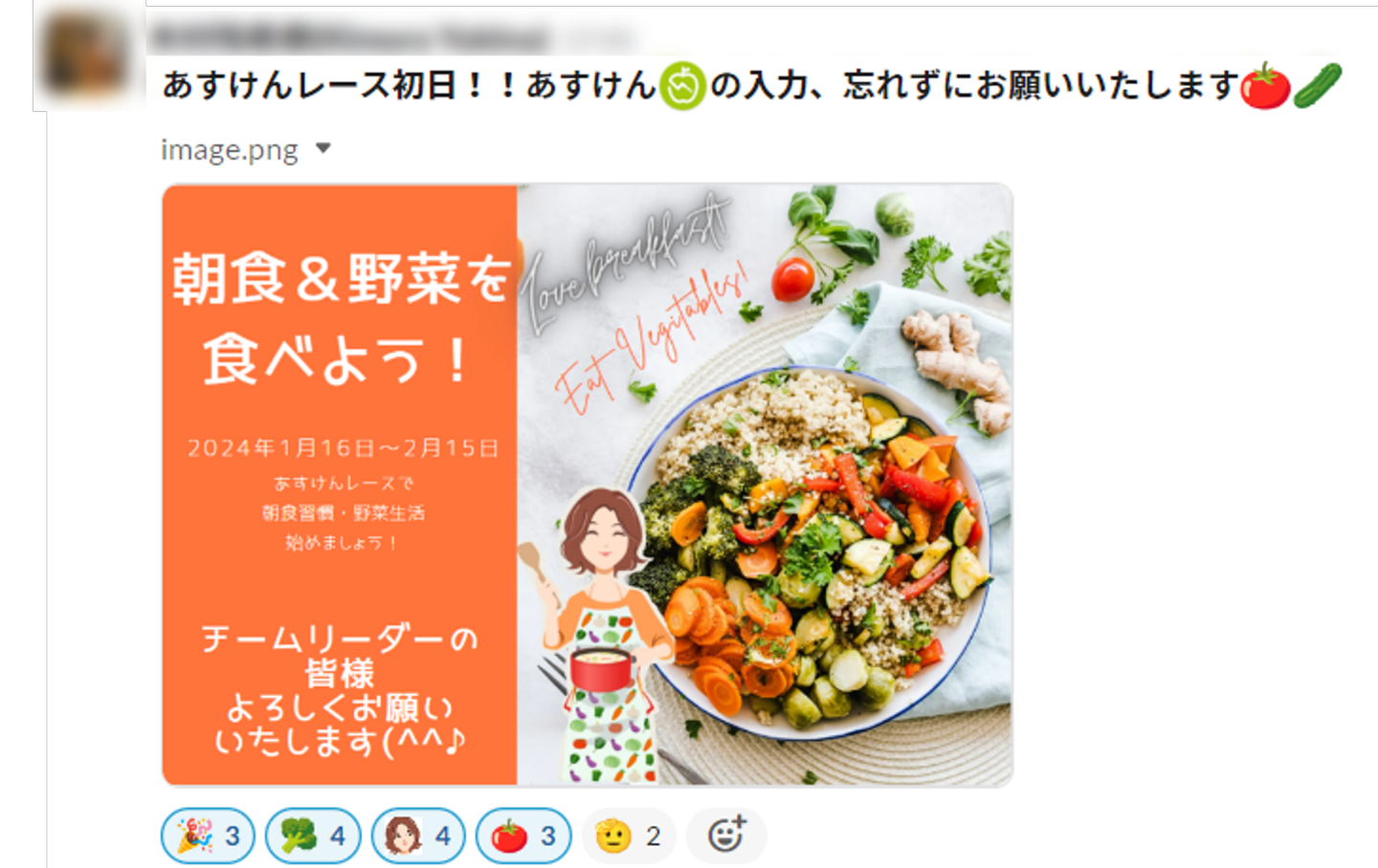 内容:部署内で3~5名のチームを作り、上記期間中、一定回数以上の朝食記録