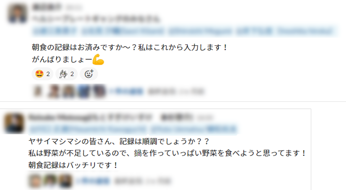「野菜」と表記します。私のチームは3名で、上記①の朝食記録を毎朝マストにし、野菜摂取量の達成は努力目標にするという方針で進めていきました。