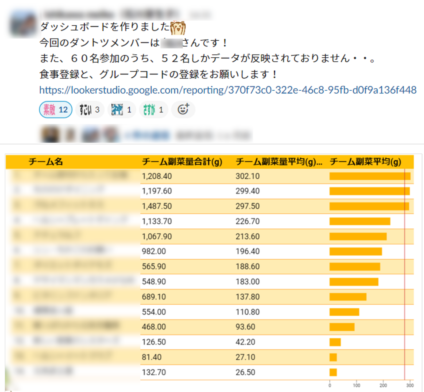 全14チームのうち、野菜摂取基準を達成したチームが3チーム、朝食摂取基準を達成したチームが11チームという結果でした!野菜摂取基準を満たすのは難しかったですが、今回のイベントをきっかけに、野菜や朝食を食べようという意識が高まったのではないかと思います。