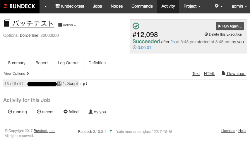 今回はジョブ内に直接bashを記述しましたが、サーバに配置したスクリプトファイルを指定して実行することももちろん可能です。スケジューラは脱cronしたいけど、これまでに作ったスクリプトは流用したい、 みたいなケースにも応えられるのは良いですね。実行!