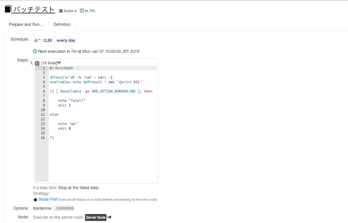 やったー。30分置きに/varのサイズを監視して、Optionsで指定されているborderline(閾値)を超えたら異常ステータスを返すジョブです。簡素。