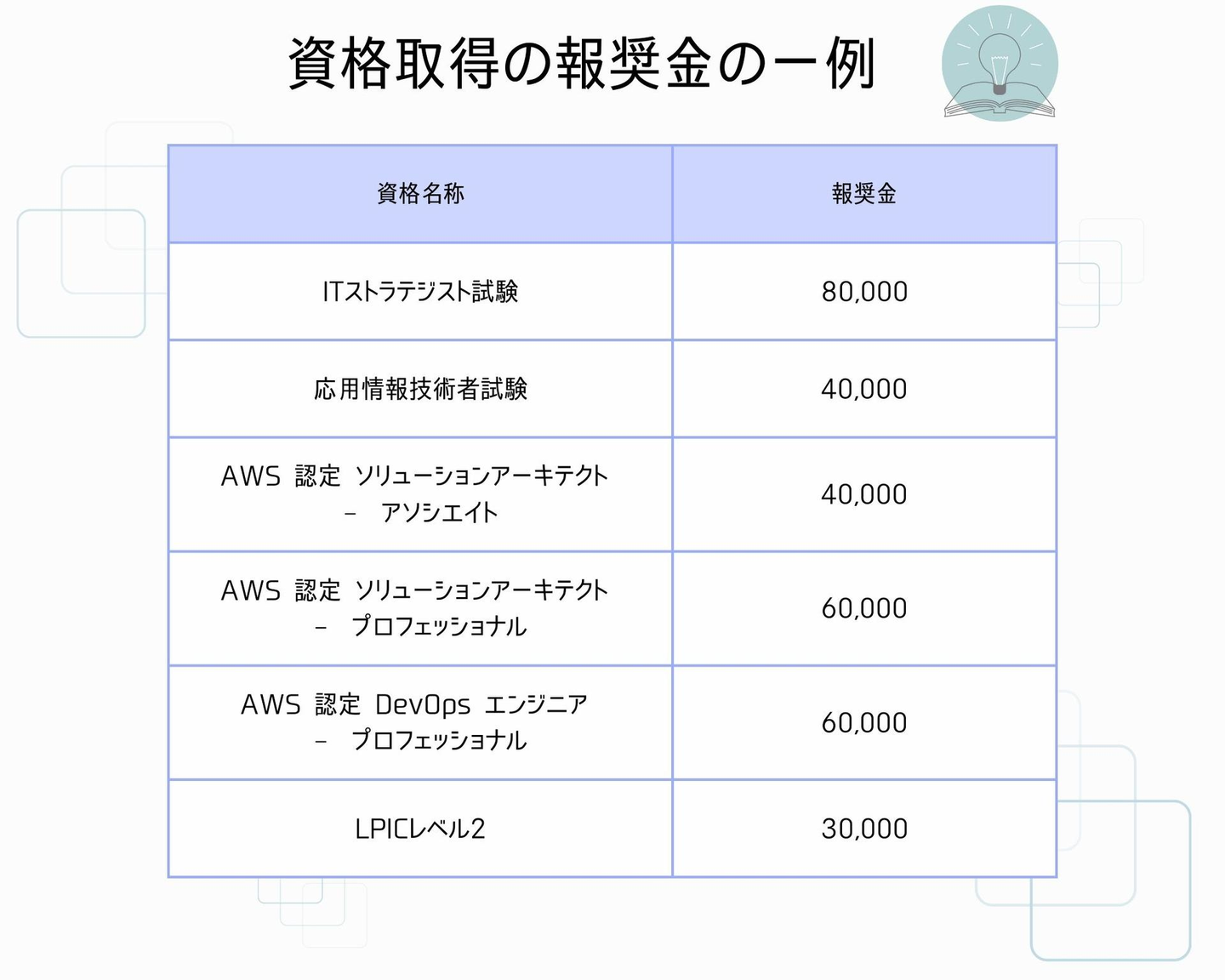お気づきの方もいらっしゃるかもしれませんが、後半の方に技術的な資格以外のものもラインナップされています。業務に活かしていけると判断された資格についてはどんどん追加されていく仕組みです。(社員からの提案で追加された実績あり)