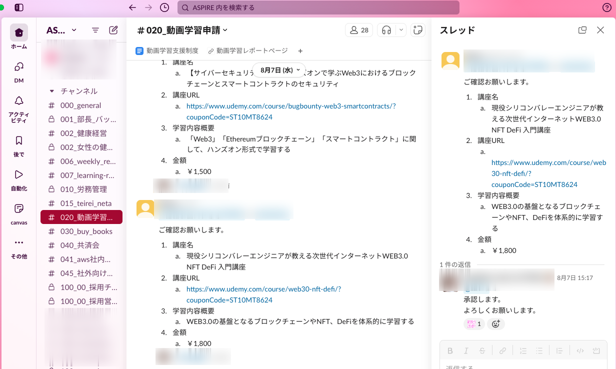 ① slackの動画学習申請チャンネルで上長にメンションし、必要事項(講座名・URL・学習内容概要・金額)を記載して申請。基本的に即日承認が下ります。