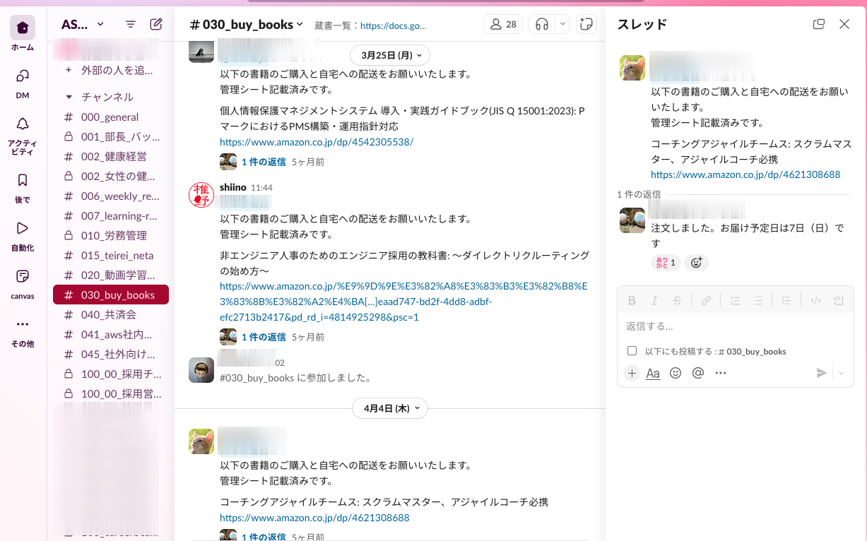② slackの書籍買い放題制度用のチャンネルで、バックオフィス担当者へ購入を依頼する