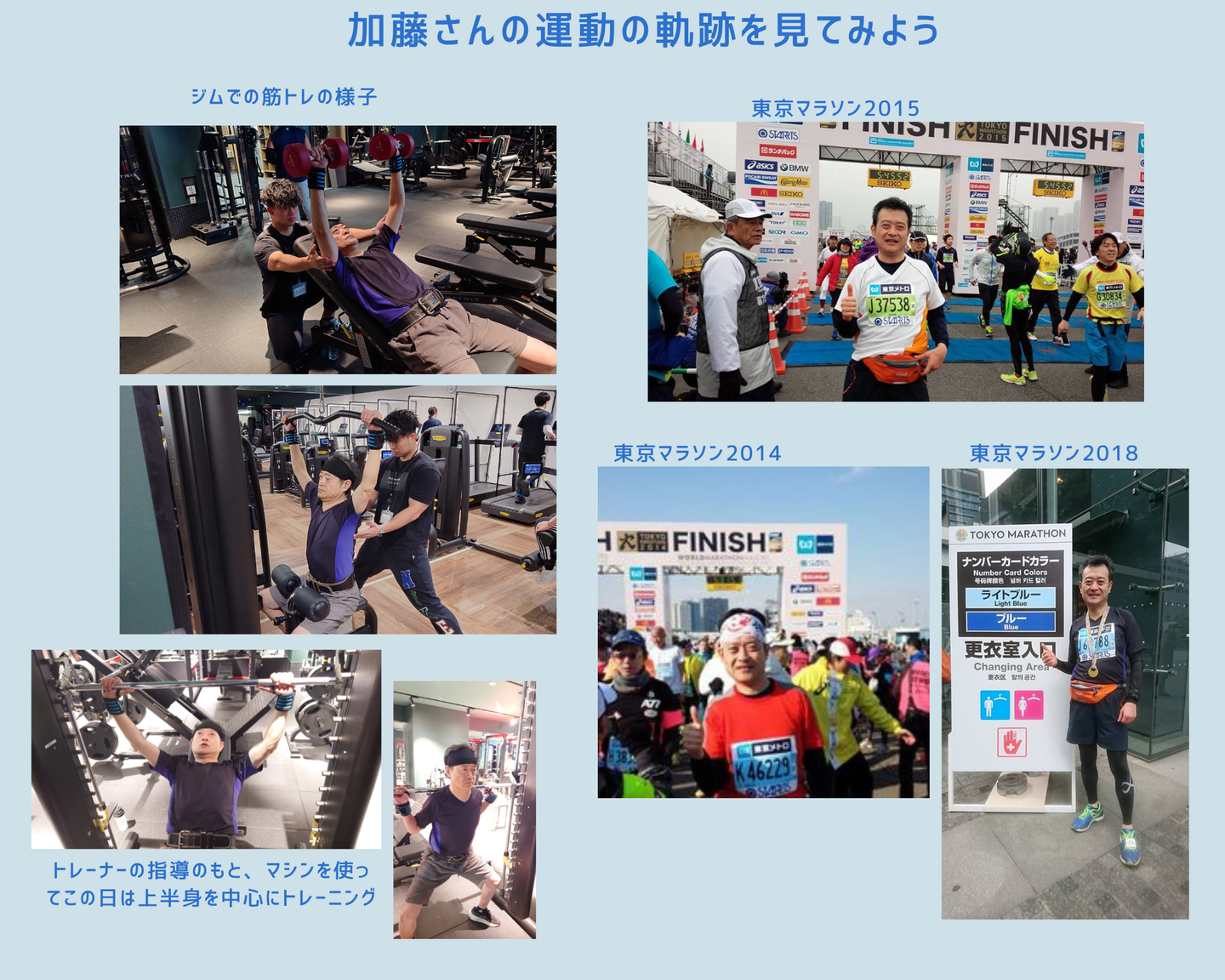 最近通っているのは週2回のパーソナルトレーニングです。膝を痛めてしまいましたが今後も走り続けていきたいので、走るために正しいトレーニングを行いたいと考え、トレーナーに指導してもらいながらトレーニングするようになりました。主にマシーンを使用して筋トレを行い、通う曜日によって上半身と下半身を交互に鍛えるようにしています。今後は筋トレも継続して行っていくつもりです。