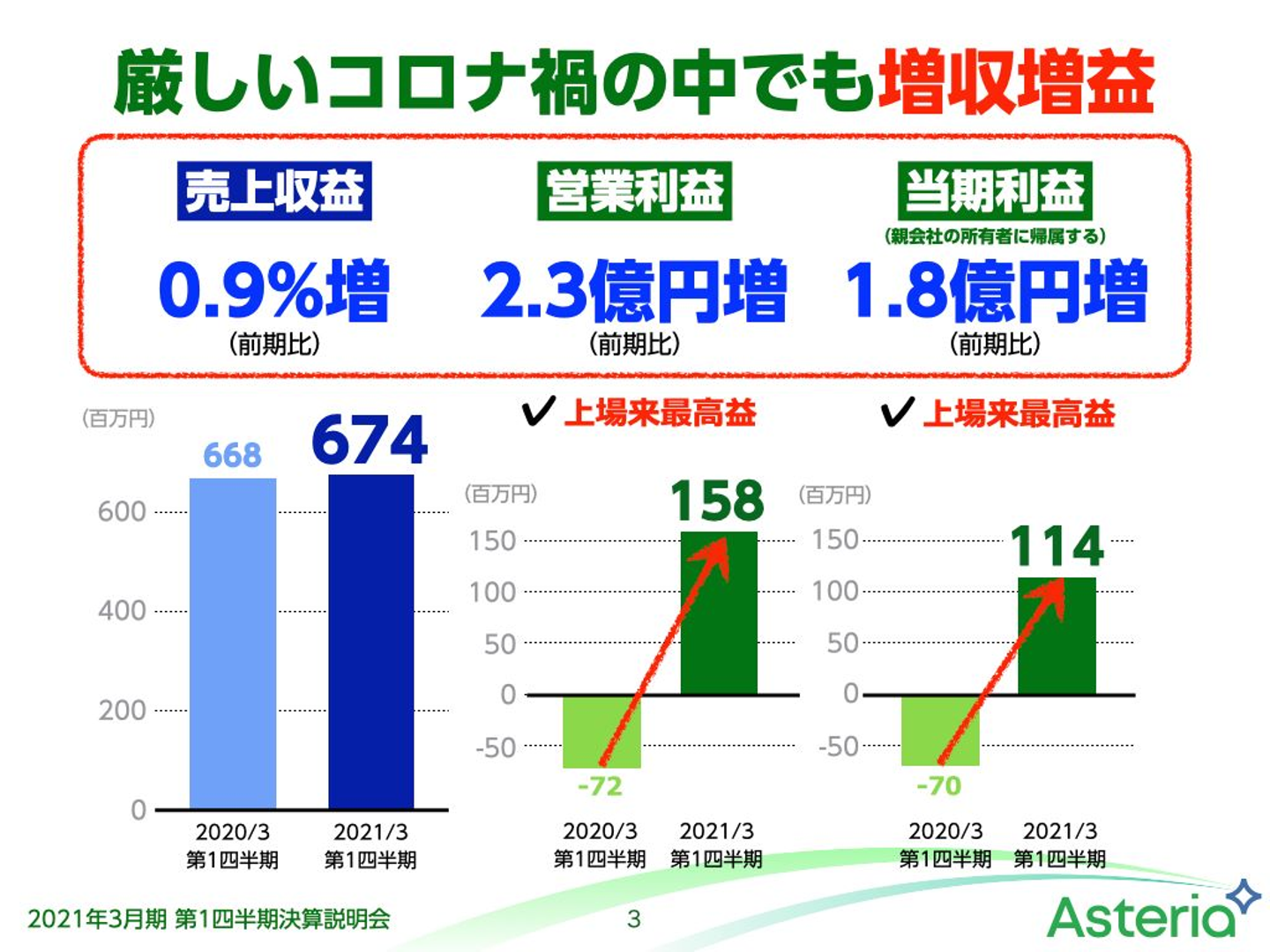 8/13(水)15時に、2021年3月期 第1四半期決算を発表しました。コロナ禍で厳しい環境ではありましたが、第1四半期として営業利益、当期利益ともに上場来最高益となりました。