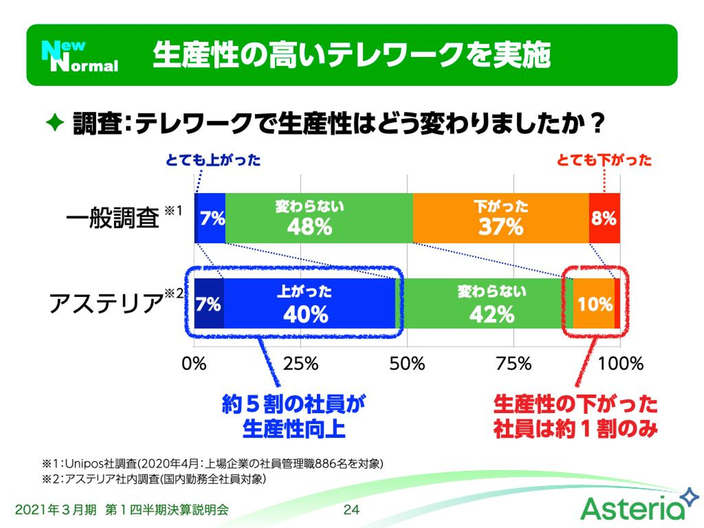 アステリアでは4月〜6月の第1四半期全期間において90%以上のテレワークを実施したにもかかわらず「増収増益」の結果を出せた理由は「テレワークでむしろ生産性が上がった」ことも要因の一つです。オフィスワークに比べて生産性が上がった社員は約5割、生産性が下がった社員は約1割。