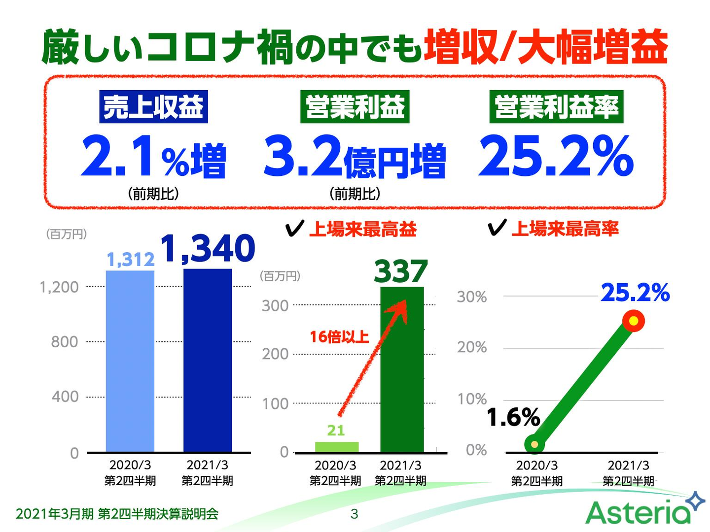 上半期を通じて9割以上のテレワークを実施する中でのこの結果は、アステリアのビジネスモデルが、コロナ禍に強い、つまり大きな変化にも強いということの証明でもあります。もちろん、この業績はパートナー企業の皆様、ユーザーの皆様のおかげです。この場を借りまして、改めて感謝申し上げます。