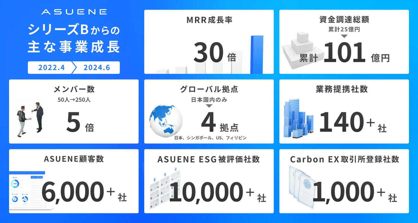 CO2見える化・削減・報告クラウドサービス「ASUENE」は、シリーズB資金調達時と比較して、受注MRRベースで30倍に急成長、顧客導入社数*国内No.1で 6,000社を突破、提携企業数は140社を超えています。ESG評価クラウド「ASUENE ESG」は、被評価企業数が約10,000社を越え、多くの企業のESG経営を推進しています。また、SBIホールディングスとの合弁会社「Carbon EX」を設立と、カーボンクレジット取引所のサービスをローンチし、プラットフォームの登録社数は1,000社以上となっています。