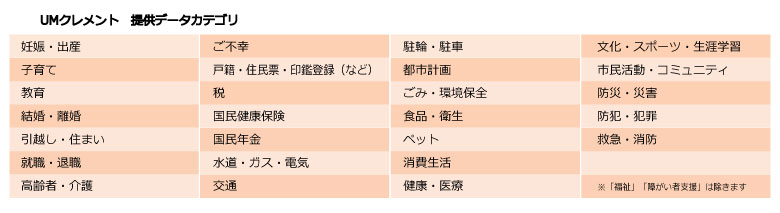 ユニバーサルメニュー(UM)は、国及び自治体等が提供する「子育て」「介護」「防災」など様々な行政サービス情報を、誰もが簡単に検索・活用できることを目指し設計されています。ユニバーサルメニューは、国がオープンデータの参考に示す自治体向けのタグや、概要や対象者などの項目名(語彙)を用いて設計されているため、利用者が行政サービス情報を簡単に検索・活用できるウェブサイトやシステムを容易に構築できます。