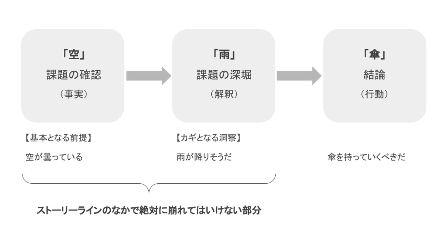文章の書き方で「起承転結」を学ぶように、一般的にグループに分けられた繋がりのあるストーリーは、相手にわかりやすいと言われます。そのストーリー構造を、端的にロジカルに適したものが「空・雨・傘」です。