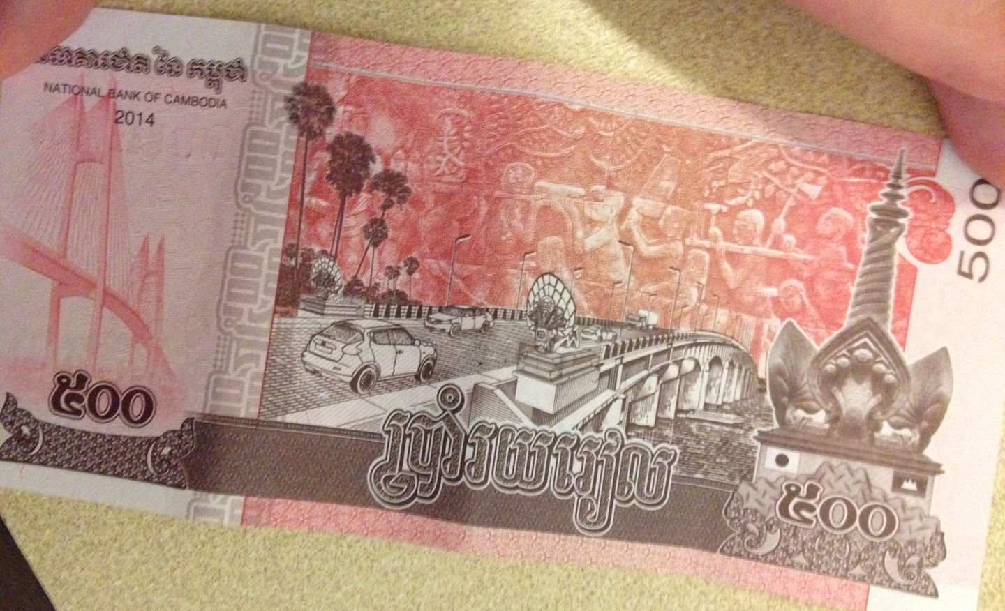 こちらは現地のお金、500リエル札(4000リエルで1ドルです)