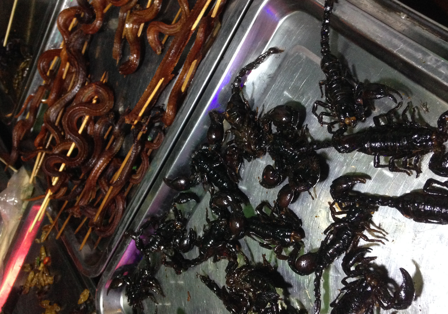 屋台ではヘビ、サソリ、カエル、タランチュラなども売っていました。