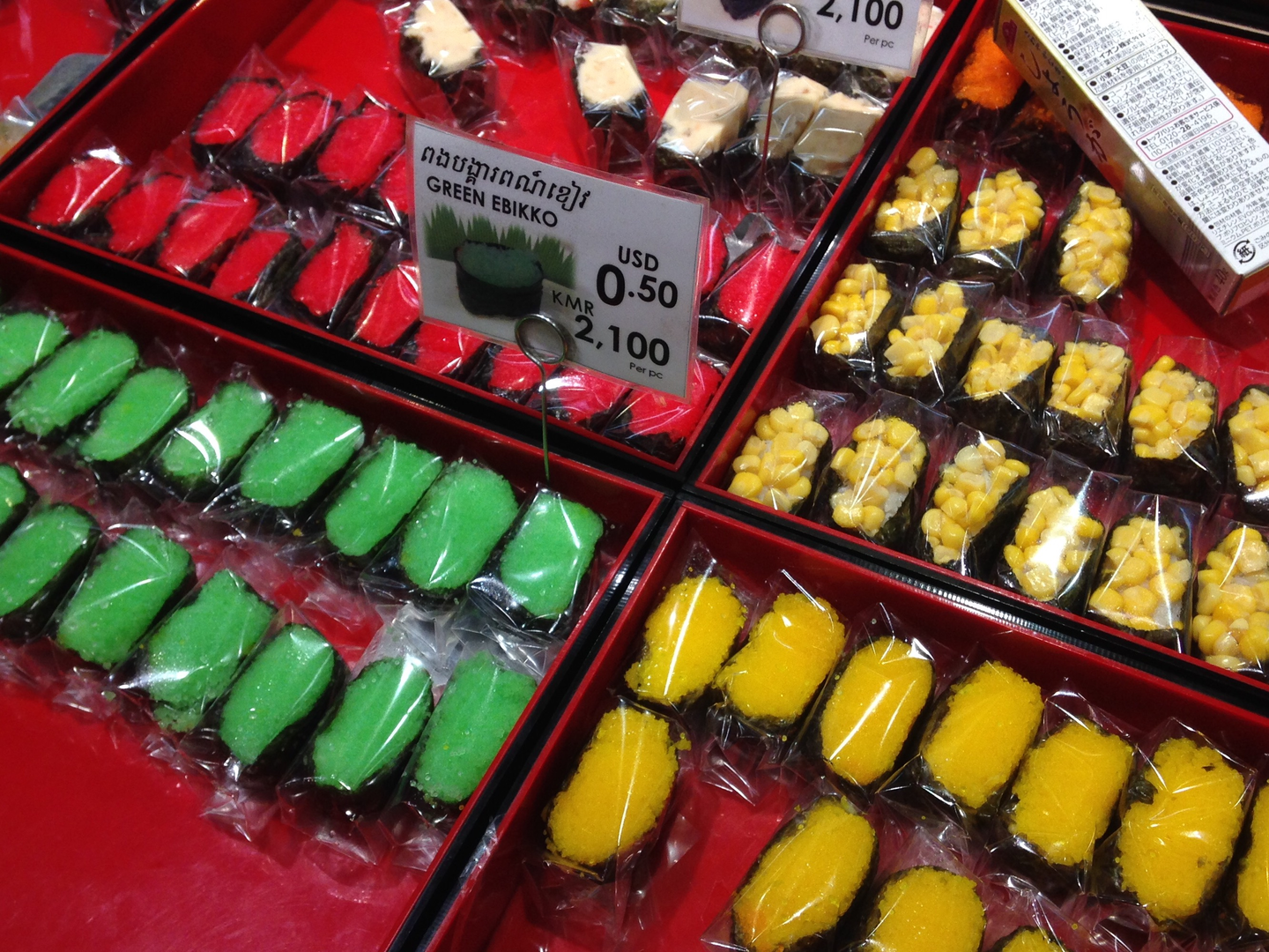 お寿司もあります!が、海外らしい色合いの品揃えも紛れ込んでいますね。