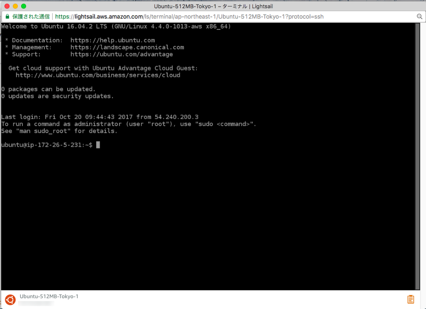 ちゃんと、作成したインスタンスにSSHで接続されます。