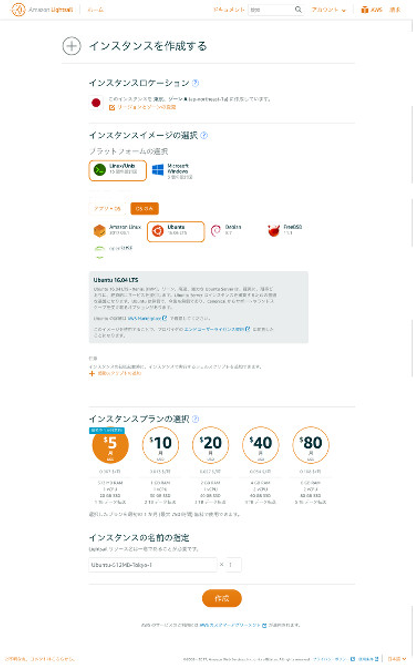 次に、「プラットフォーム」ですがOSの大きな区分として、Microsoft か Linux かの踏み絵を迫られます。MacBook Pro と Surface Laptop ユーザーである私には重たい選択ですが、躊躇なく Linux で、そしてOSのみ Ubuntu(ウブンツ)をセレクトします。他のでもいいんだけど、Debian(デビアン)だと悪魔教の創始者っぽいし、openSUSE ってなんで読むか自信ないしでブブンツもとい Ubuntu に。最後に作成ボタンをポチります。
