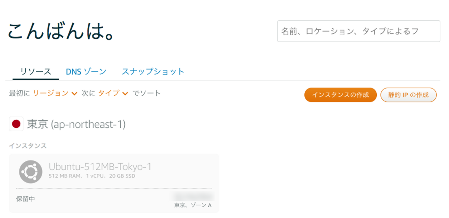 こうして固定IPがセットされた Ubuntu のインスタンスが出来ました。