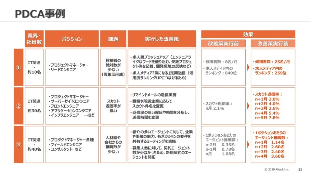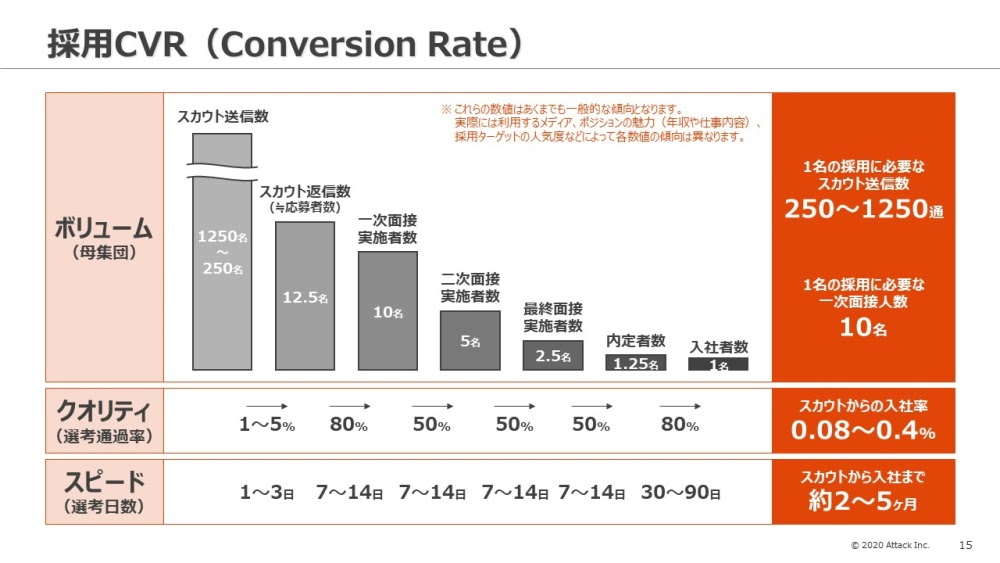 エンジニアを含む採用プロジェクトは「ボリューム(母集団)×クオリティ(選考通過率)×スピード(選考日数+採用活動期間)=採用人数」という方程式で成り立ちます。それぞれの要素を最大限高めることで、質の高い候補者を効率良く採用成功に繋げることが可能です。実際にAttackではこの方程式を用いたことによる改善成功事例も。ぜひ一度試していただきたい手法です。