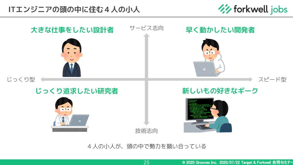 「エンジニアの頭の中には4種のペルソナが存在する」と赤川さん。エンジニアの志向性は一言でまとめられるものではなく、いくつかの価値観や考え方が融合して出来上がっているんです。1つ目のタイプは「早く動かしたい開発者」。2つ目のタイプは「新しいもの好きなギーク」。3つ目のタイプは「大きな仕事をしたい設計者」。4つ目のタイプは「じっくり追求したい研究者」です。これら4つのタイプが、エンジニアの頭の中で、状況により強まったり弱まったりするイメージ。それぞれのタイプに合った企業や部署、職種を提案することで、候補者の方に選んでもらえる確率が高まります。