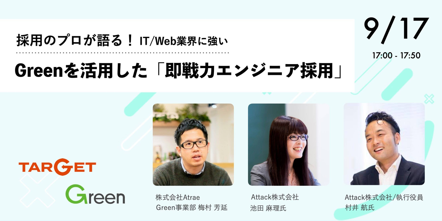 9月17日(木)17:00~17:50、Greenを運営する株式会社アトラエ様と合同で無料オンラインセミナーを開催いたします! テーマは『即戦力エンジニア採用』。