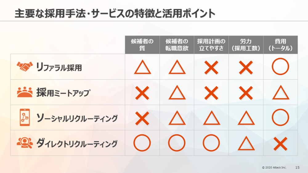 :SNS型・ダイレクトリクルーティング等、それぞれの採用手法における特徴やポイント