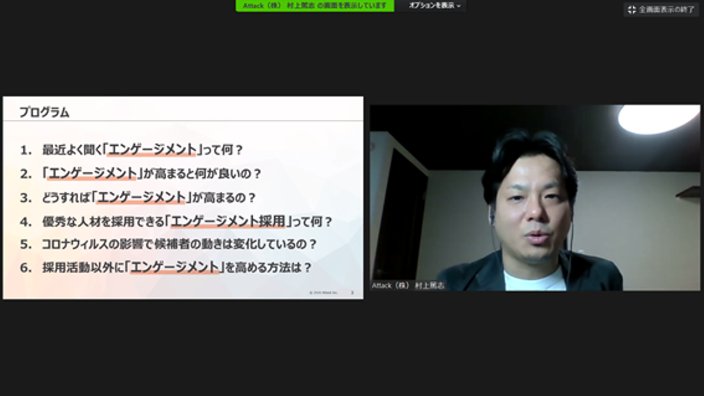 こんにちは! Attackの志摩です。今回は12月23日(水)に開催された無料オンラインセミナー『エンゲージメント採用の秘訣~優秀な候補者の採用と従業員の就労意欲向上を同時実現する~』のレポートをお届け。簡単ではありますが、セミナーの重要ポイントに絞ってお伝えします!