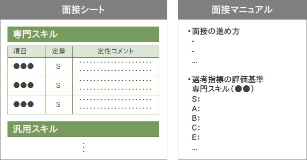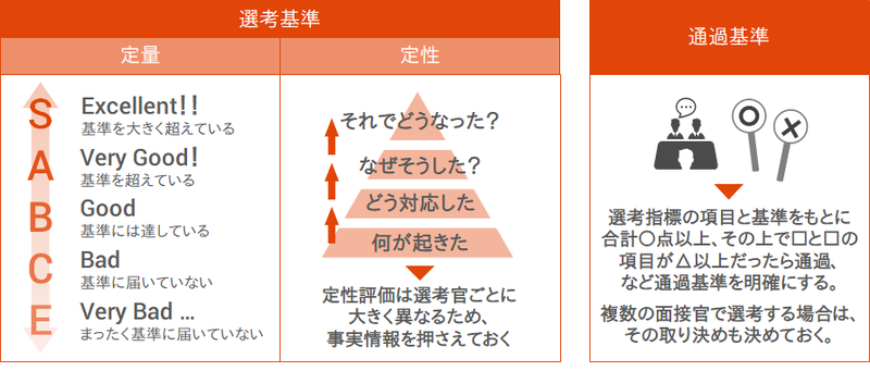 基準にも2つあり、そもそもの「選考基準」と次の選考に進めるか否かの判断となる「通過基準」です。選考基準に関しては、定量的な判断基準(五段階、100点満点など)と定性的な項目として何を聞くかを明確にしておくと、選考官による評価の「ブレ」が少なくなります。