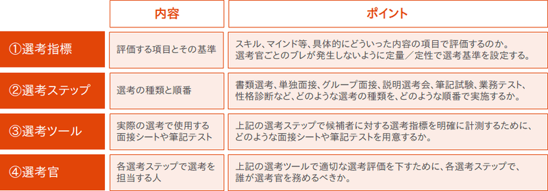 まず候補者選考を進めるためには、以下の4つの要素を制定していく必要があります。