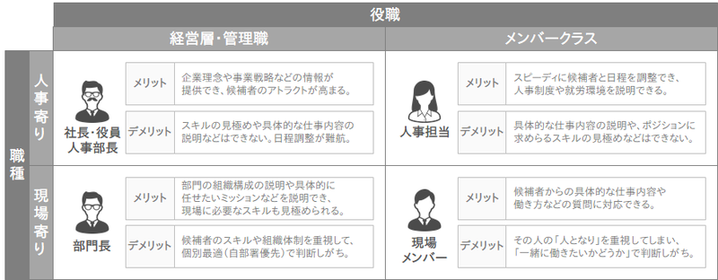 かといって「じゃあ、技術面、人物面の両方がチェックできる社長をすべての面接官にアサインしよう!」というわけにもいかないと思います。結局のところ、選考官ごとにメリットとデメリットが存在しますので、それを踏まえた上で適切な面接に適切な選考官をアサインすることが求められます。