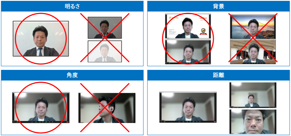 基本的には対面での面接と同じですが、オンライン面接では選考官の印象管理に注意しましょう。画面の適度な明るさや、白基調の背景、カメラを見ること、適度な距離感など、細かな配慮が好印象に繋がります。