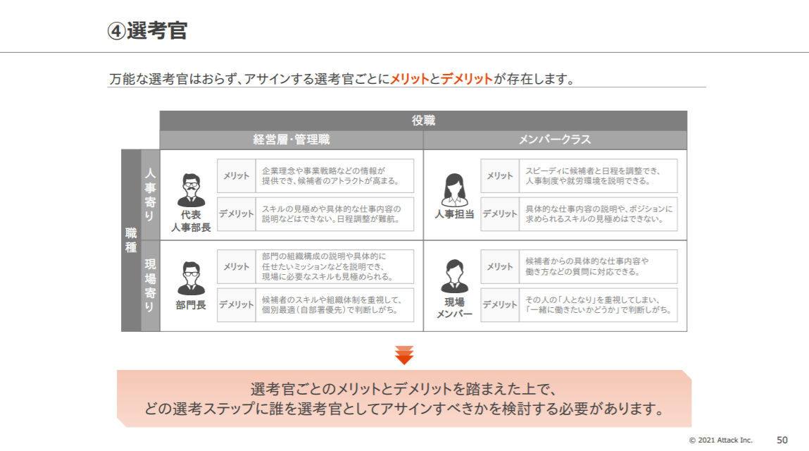 社内メンバーの中から選考官を選定します。ポジションや役職によってメリット・デメリットがあるので、それらを踏まえた上でアサインしましょう。