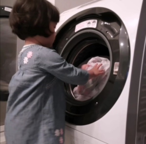 ▲洗濯機を回すお手伝いをする3歳の娘(髙山)