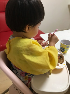 ▲安定感のあるハイチェアに座り、練習用のお箸でご飯を食べる息子(加納)