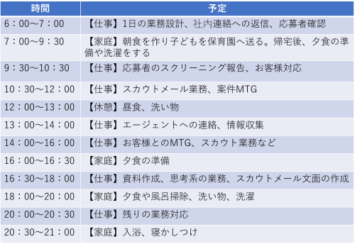 とある日のスケジュールです。朝早くに出勤して、途中で休憩を挟んで家事や子育てをしつつ、20時~21時まで勤務しています。自分自身のライフスタイルに合わせて仕事のスケジュールを決めています。