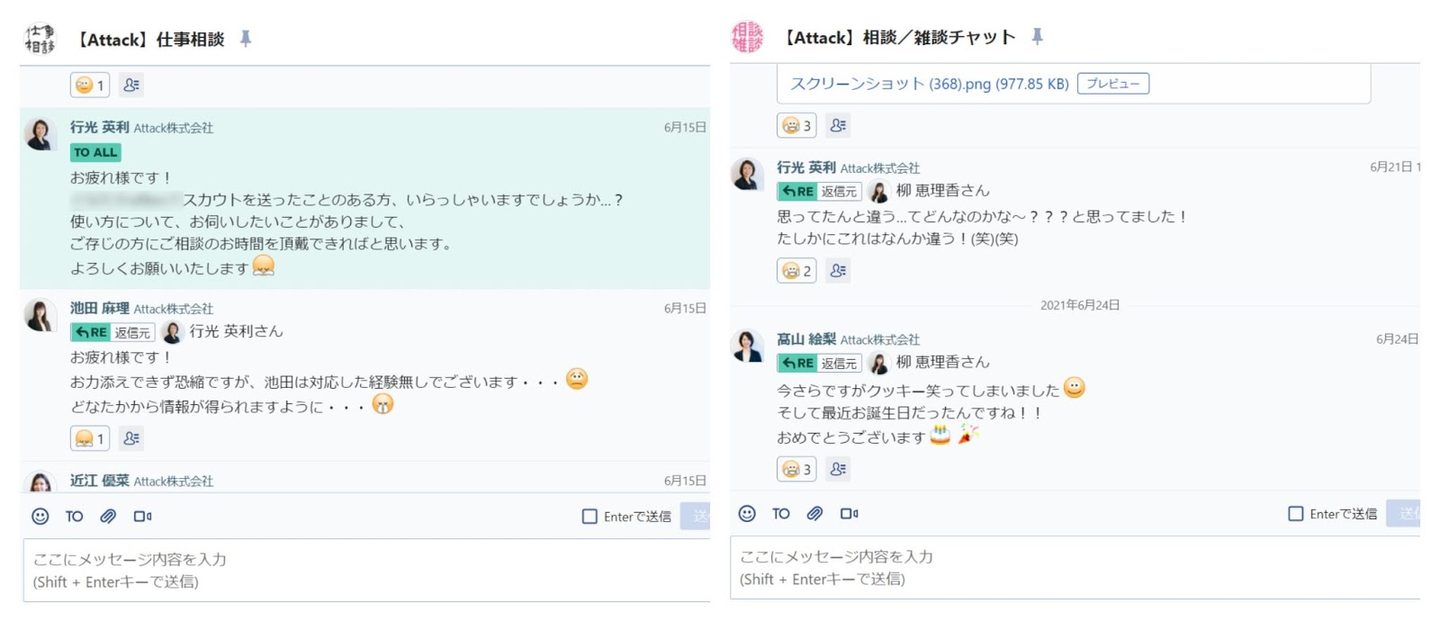 ▲フルリモートでもコミュニケーションを取りやすいよう、仕事相談ルームと雑談ルームが設けられている