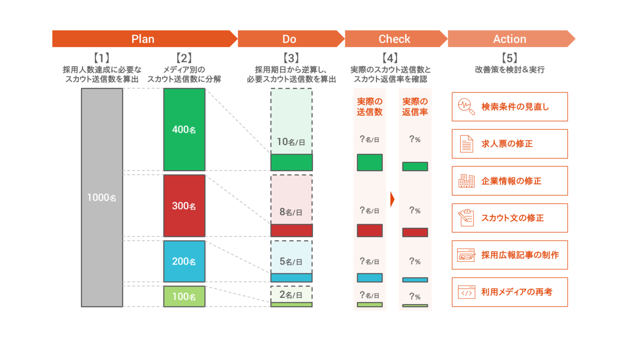 例えば上図は「ボリューム」にフォーカスしたPDCAサイクルのイメージです。スカウト(ダイレクトリクルーティング)を中心に採用活動を行う場合は、まずP(Plan)の段階で、メディアごとの「母集団形成ポートフォリオ」を設計する必要があります。そして採用期日(期限)と想定スカウト返信率から逆算して、デイリーで必要なスカウト送信数を算出し、愚直にD(Do)=スカウトを実行していきます。