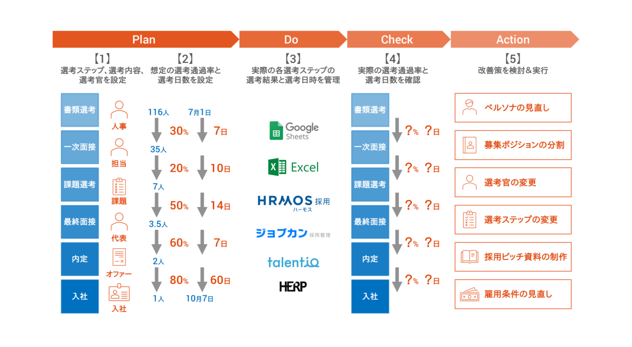 目標KPIが設定されたら、あとは採用活動を進めるのみ…とはいきません。母集団形成が成功して、選考通過率も良くて、選考日数も少なく、設定した目標KPI通りに進む採用活動などありません。せめて週次ベースで目標KPIと実績KPIとの比較を行い、どこの何の数値が予想より良いのか悪いのかを見て、適切な改善策を講じていく、つまりPDCAを回していく必要があります。
