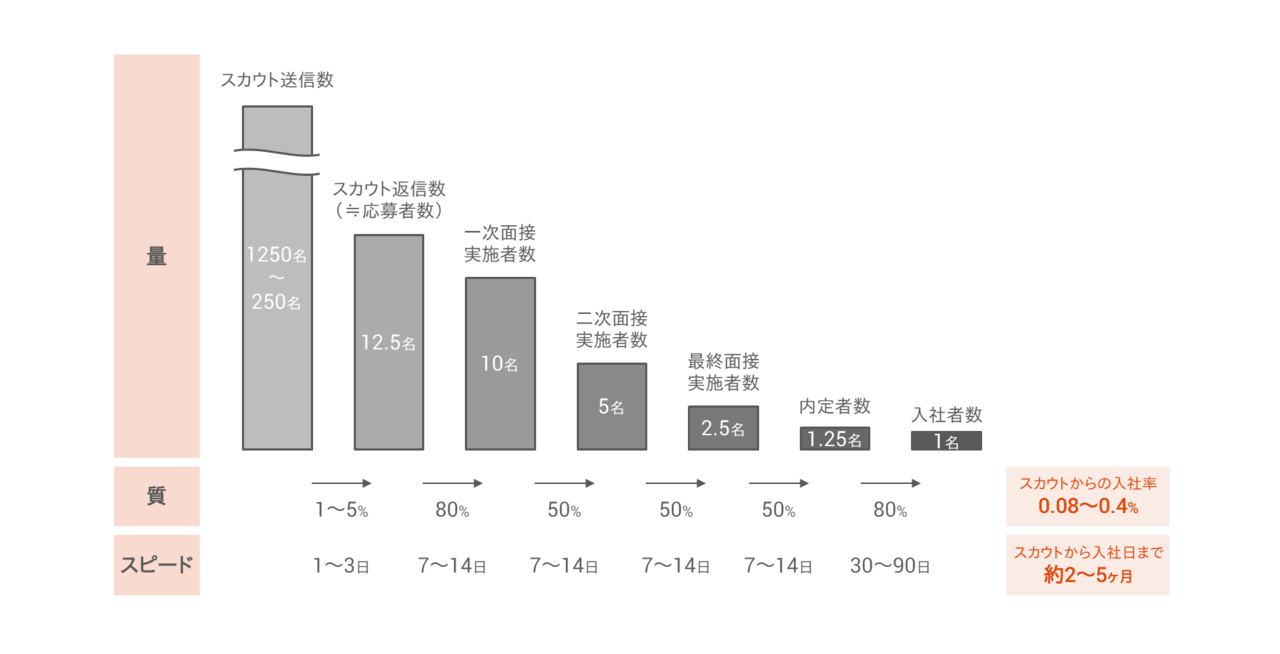 スカウト返信率にもよりますが、平均的には1名を採用するために、2~5ヶ月前までに、250~1250名へのスカウト送信が必要となっております。