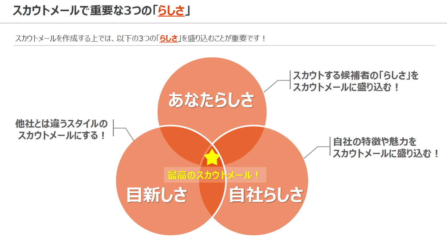 続いて、スカウトメールを作成する際に重要となる3つの「らしさ」について、実例を交えながらお伝えしました。