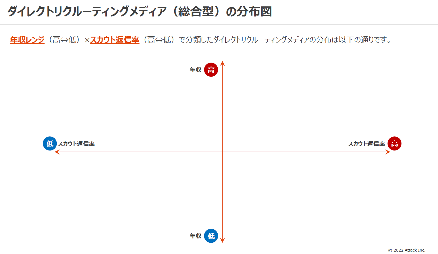 まず、各ダイレクトリクルーティングメディアを、「年収レンジ(高⇔低)」と「スカウト返信率(高⇔低)」で分類。登録者層の志向性や特徴の説明を交えながら、各メディアをマッピングした分布図を紹介しました。