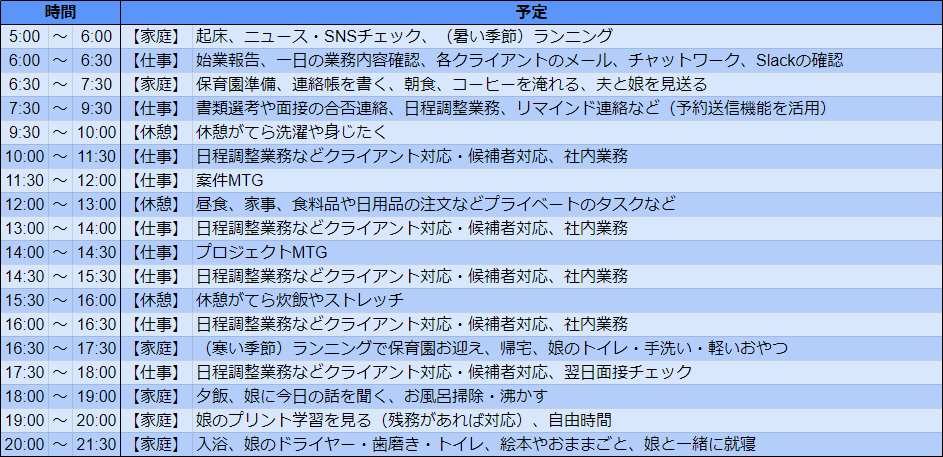 自由度が高い分、自分なりに大まかにスケジュールを決めています。例えば、5時に起床して6時に始業し、可能な限り12時台か13時台に昼食。17時に子どもを保育園にお迎えに行き、18時に夕食を食べます。20時には入浴を済ませ、21時半には子どもと就寝していますね。ある程度スケジュールを決めることによって、リズムが整いますし、メリハリをつけられます。