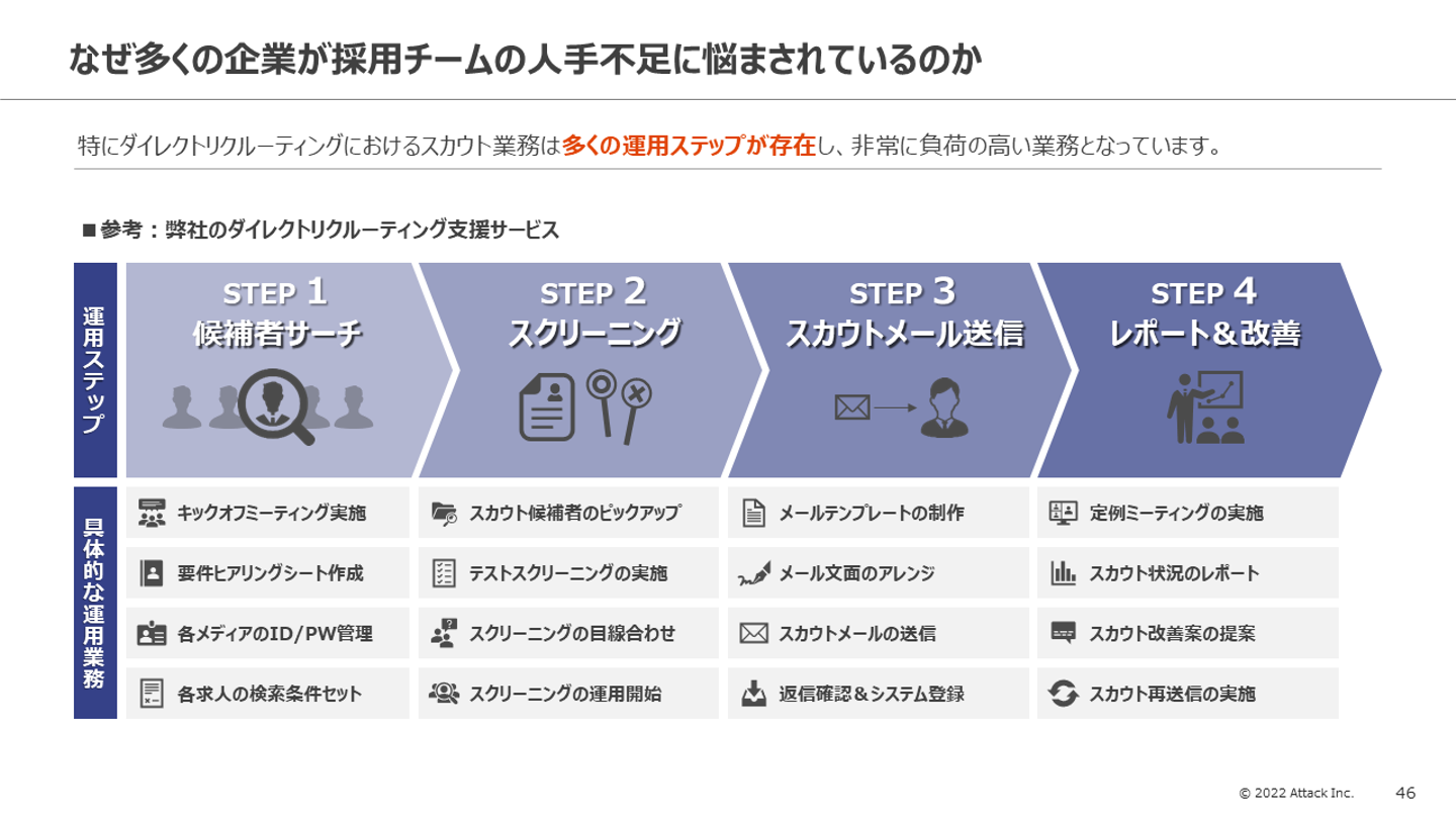 ダイレクトリクルーティングは、候補者サーチ→スカウトスクリーニング→スカウトメール送信→レポート・改善というようなPDCAを回す必要があります。この業務においてスカウトの返信率がポイントとなりますが、この返信率は、既読率・閲覧率・応募率の3つに細分化することができます。このように数値分析をしながら改善業務を行っていくことが求められるため、これまでの業務内容やスキルセットとは異なり、業務負担の増加に繋がります。