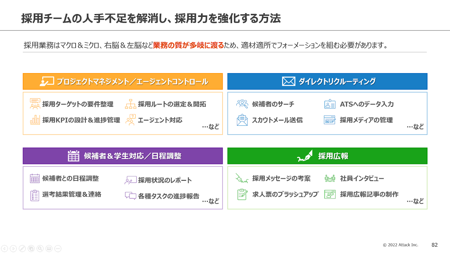 採用業務と一口で言っても、必要となるスキルは多岐に渡るため、必要なスキルによって採用チーム内で適材適所のフォーメーションを組む必要があります。そのためには、業務を切り出し、外部に依頼できる業務は依頼するという考え方が大切となりますが、重要なのは業務の質(内容)による切り分けです。