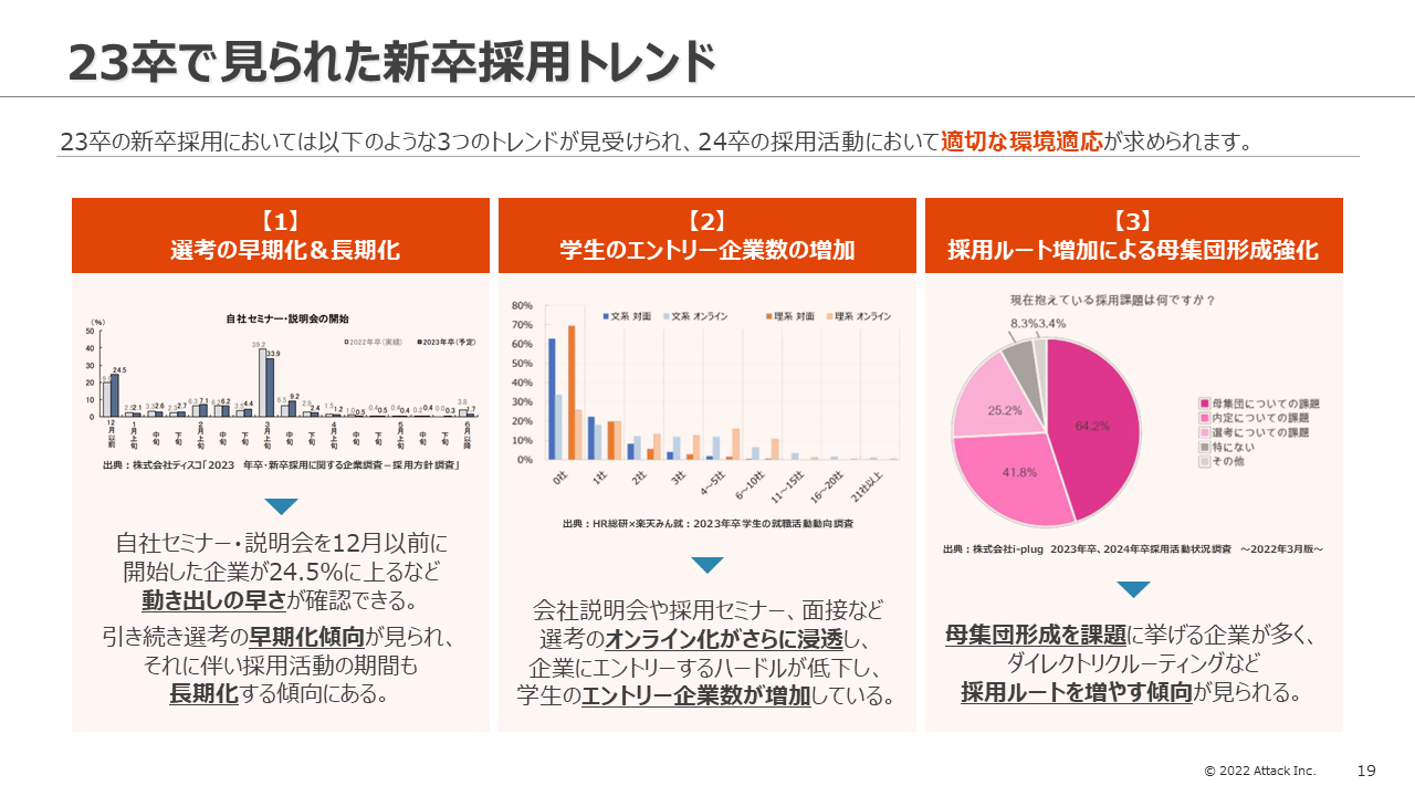 23卒採用では、以下のようなトレンドが見受けられました。これらを踏まえ、24卒の採用活動では、適切な環境適応が求められます。