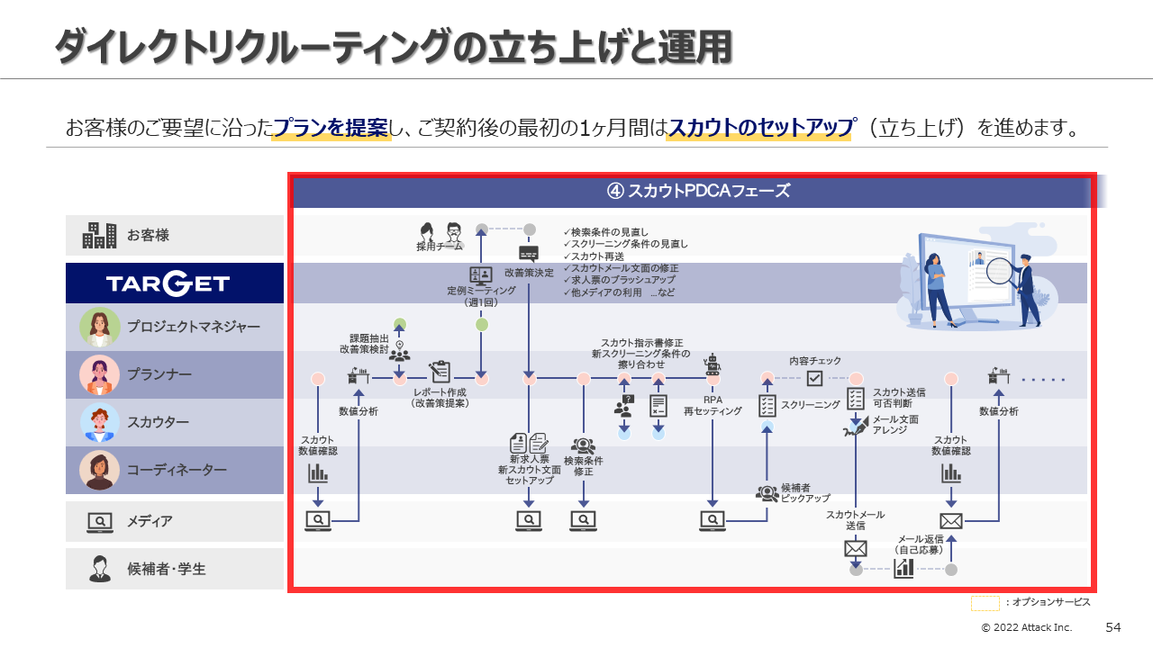村上:ご契約後は約1ヵ月間を立ち上げ準備として、「企業情報・求人票作成」「スカウトメール文の作成」「検索条件のセットアップ」を行います。弊社では、スカウト運用に特化した各種ナレッジツールやテンプレート、スカウト判断条件管理シートを活用していますが、その点はいかがでしたか?